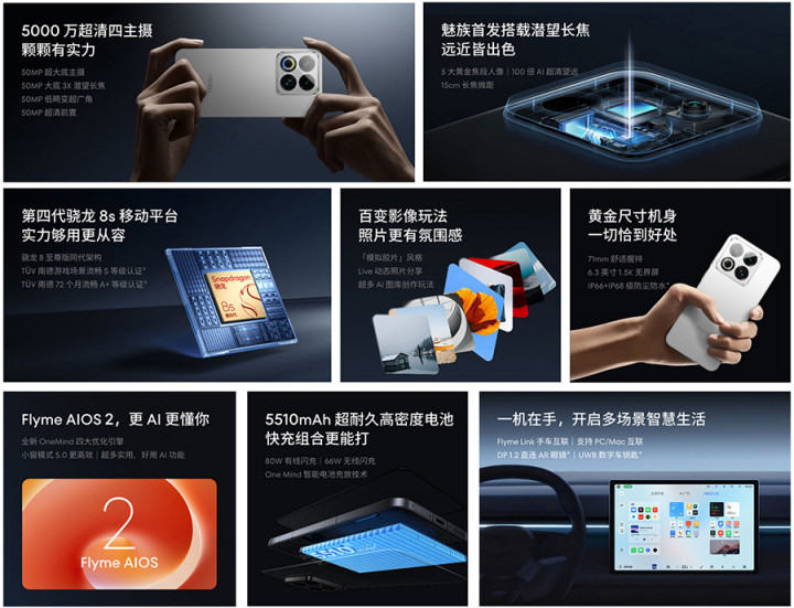 在核心配置上,魅族22同样表现出色。它搭载了高通骁龙8s Gen4处理器,配备了4500平方毫米的超大VC液冷散热系统,并通过了TUV南德72个月流畅A+等级及游戏流畅度S等级的双认证。无论是游戏热血时刻还是日常使用,魅族22都能带来流畅无比的体验。此外,魅族22还配备了5000万超大底主摄、5000万大底潜望长焦、5000万超广角以及5000万前摄的豪华相机组合,内置5510mAh超耐久电池,支持超声波屏幕指纹识别,同时配备了一体隐藏式红外智控和IP66+IP68级别的防尘防水功能,全方位满足了用户的多样化需求。