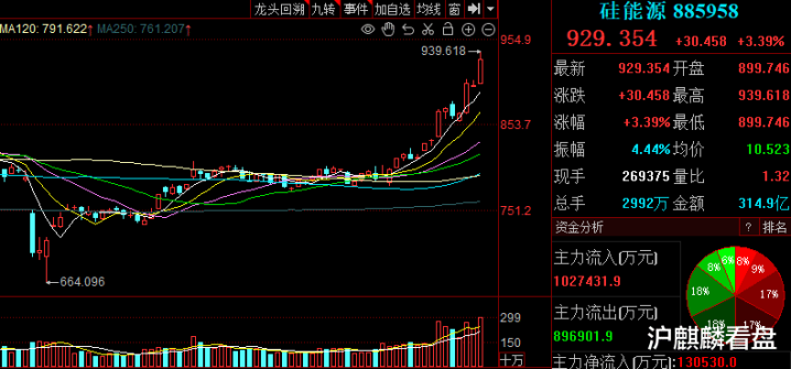 板块方面,今天依旧是轮动的行情,全天轮动了猪肉,硅能源、光伏概念、光伏设备,多元金融,电力,煤炭,铜缆高速连接,银行,房地产,创新药,稀土永磁,证券,物流,新型城镇化等10多个板块。而领涨的板块是硅能源、房地产、稀土永磁、多元金融等;居跌幅榜的板块是PCB、游戏、军工装备、存储芯片、跨境支付等。