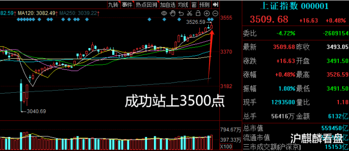 通过上图可以看出,最近三天大盘对3500点展开进攻,前天盘中最高离3500点只差0.11点,昨天盘中突破了3500点,但尾盘跳水最终收在3493.05点,3500点得而复失。那么今天大盘是低开在5日均线附近,然后逐步震荡走高,盘中最高涨到3526.59点,创了去年11月8日以来的新高,收盘是收在3509.68点,昨天我说过收盘价是一天四个价位中最重要的,那么今天可以说大盘是成功站上3500点。站上了之后,那么下一个目标就是去年10月8日的高点3674.40点,不过现在距离这个目标还有160多个点,这个空间有点大,是需要一定的时间的。一旦后面连这个高点都突破了,那么可以确定的说大盘将会开启一轮波澜壮阔的主升浪行情,当然这是后话。