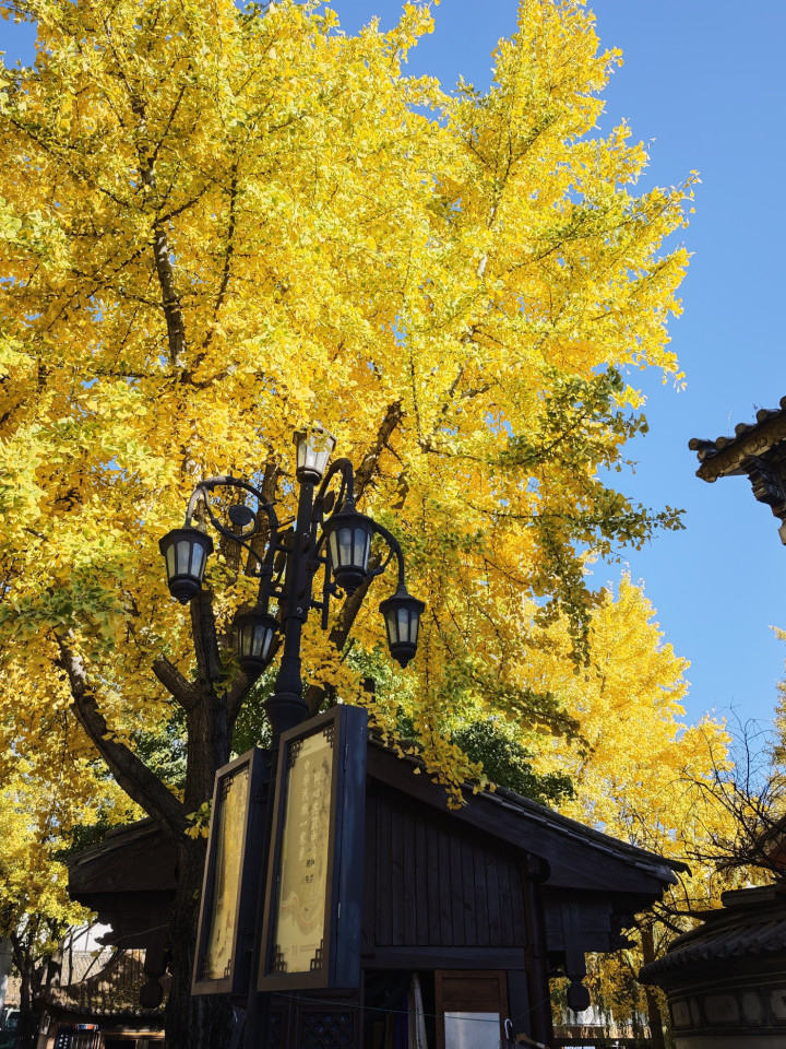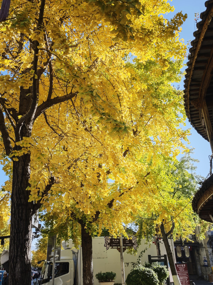 特别是天气晴朗的时候,海拔4122米的苍山点点白雪,蓝天白云的“百二河山”、蔚蓝的洱海,仿佛一下子被这一抹金黄的银杏叶照亮,成为你必须前往沐浴的“人间雨”。