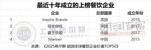 最近十年成立的四家上榜企业中,有三家源自中国,分别是2017年创立的霸王茶姬和瑞幸咖啡,以及2015年成立的Manner咖啡。上榜企业总价值5.5万亿元人民币。