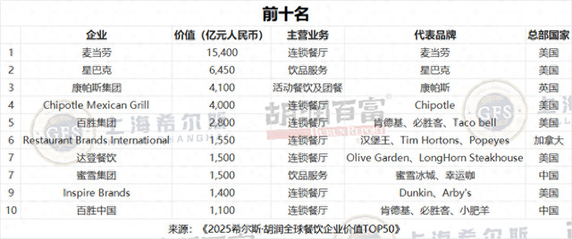 12月15日,胡润研究院发布《2025胡润全球餐饮企业价值TOP50》。TOP50的上榜门槛为120亿元人民币。11家中国企业上榜,分别是蜜雪集团、百胜中国、瑞幸咖啡、海底捞、古茗、喜茶、霸王茶姬、Manner、千喜鹤、小菜园、沪上阿姨。