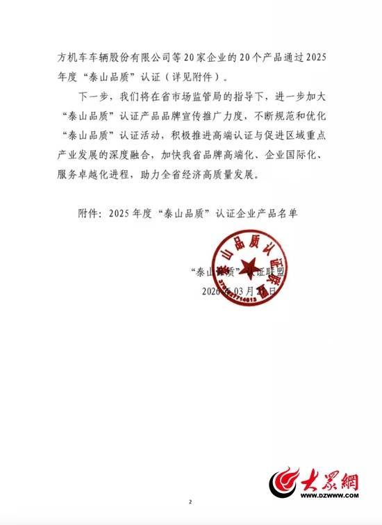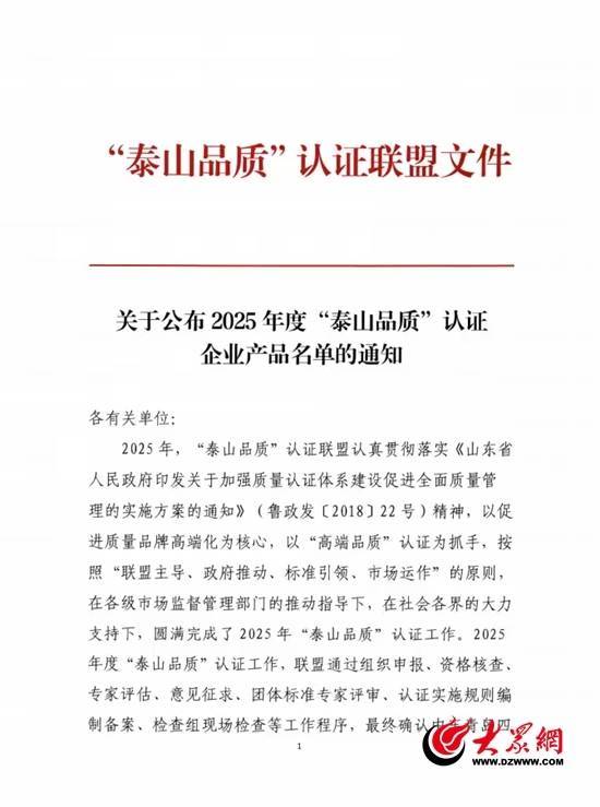 “泰山品质”认证是经国家认监委批准,由山东省引入国际通行第三方认证评价机制,依托“泰山品质”认证联盟开展的高端品质认证。旨在培育一批符合“品质卓越、自主创新、管理先进、品牌高端、标准领先、绿色发展”要求的质量品牌,是对企业综合实力的权威认可。