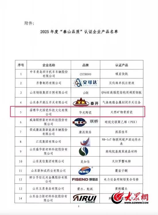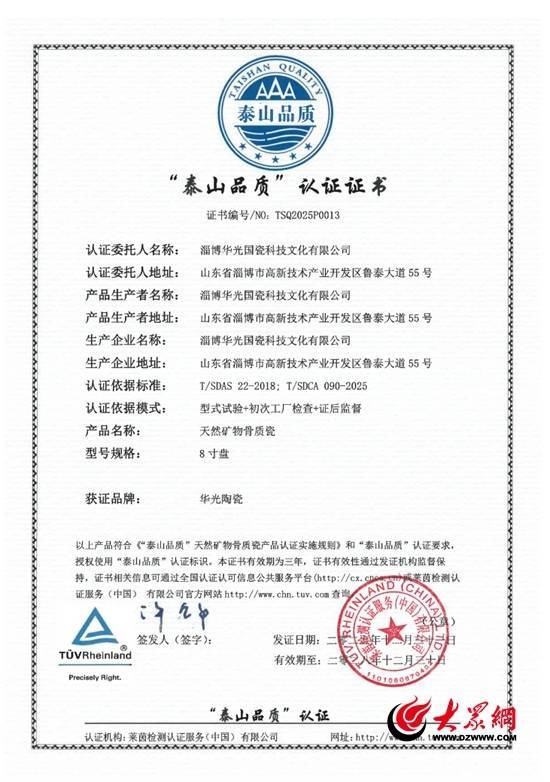 近日,“泰山品质”认证联盟公布了2025年度认证企业产品名单,全省20个产品上榜。淄博市推荐的淄博华光国瓷科技文化有限公司自主研发的天然矿物骨质瓷成功入选。目前,淄博市已有8家企业荣获“泰山品质”高端认证。