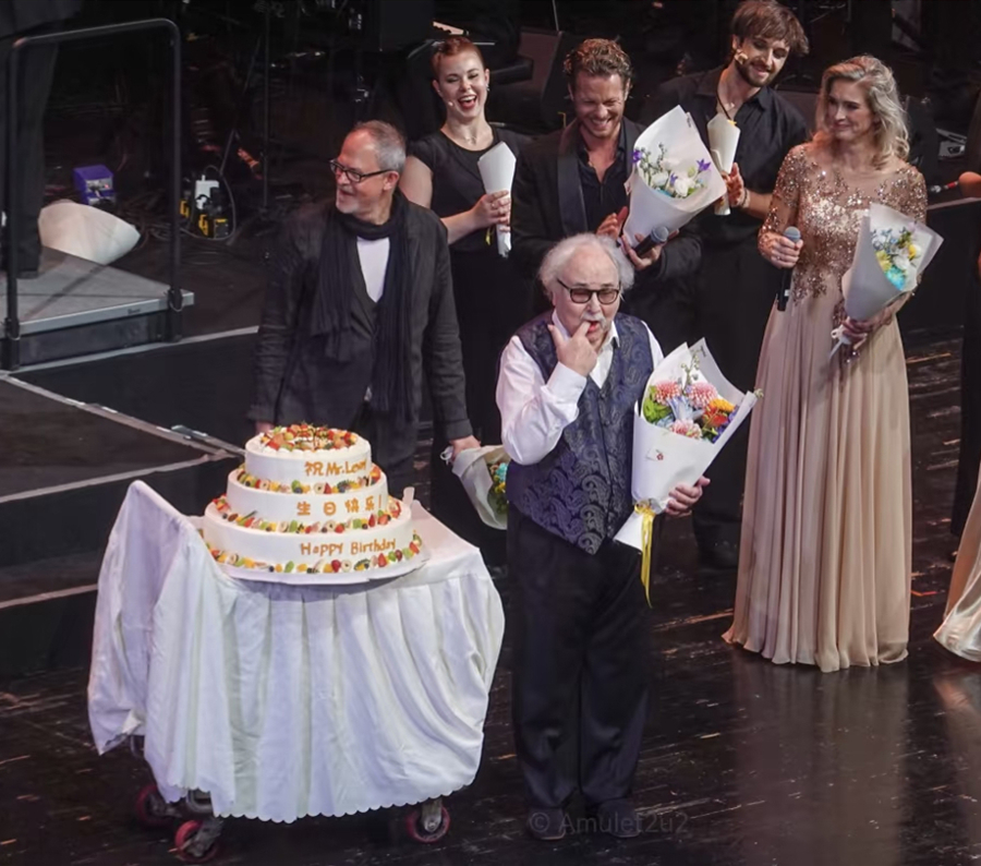昨晚演出的尾声,里维携舞台上的众位艺术家,共同演绎《如此的一天》。文化广场为远道而来的艺术家们精心准备了花束与蛋糕,既是庆祝里维先生的八十年的炽热人生,起点亮文化广场十四周年的庆典之光。